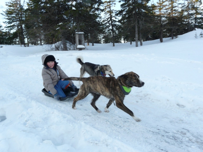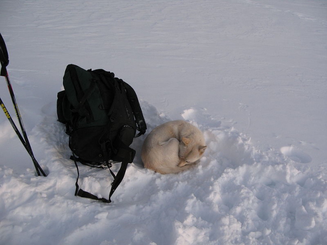 В лыжном походе за нами увязалась собака. Среднего роста подтянутая самка. Не шакалила, не клянчила, вела себя прилично. Было такое ощущение, что ей попросту интересно пройти маршрут в нашей компании.