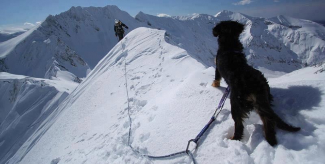 А к перевалу подошли, дальше что? Благо перевал простой был, да и снегу много, он сам прошёл. А дальше что? Тогда псу сказочно повезло, у нас заболёл участник, пришлось спешно сворачивать маршрут и простым путём выходить в населёнку. Там, к счастью, его удалось пристроить.