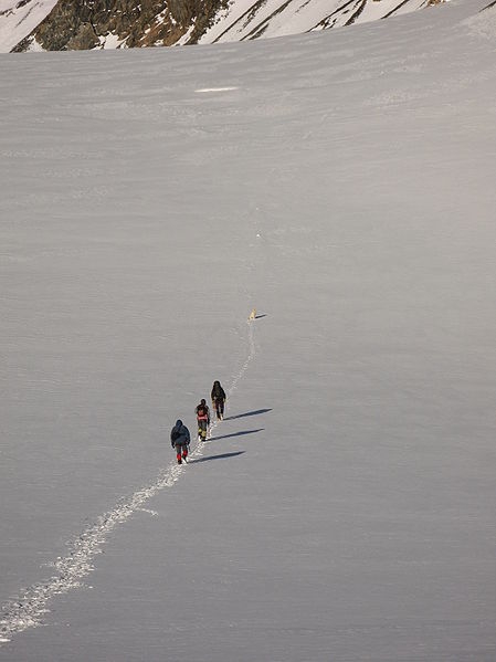 Случай первый, Центральный Кавказ, перевал, кажись, Бечо. Там здоровый ледник с большим количеством трещин. Тропа идёт в обход по краю ледника. А нам с чего-то приспичило сократить путь и пропереться по леднику. Благо он пологий и открытый был.