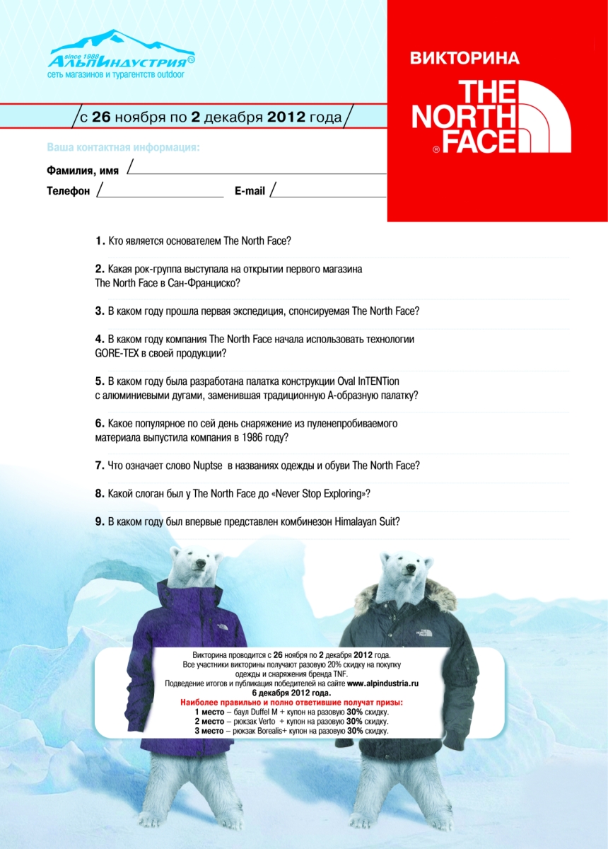 С 26 ноября по 2 декабря 2012 года в московских магазинах Альпиндустрия проходит неделя The North Face. Всем покупателям и ценителям бренда, участвующим в викторине - скидка 20% на продукцию TNF, а лучшим знатокам - призы.
