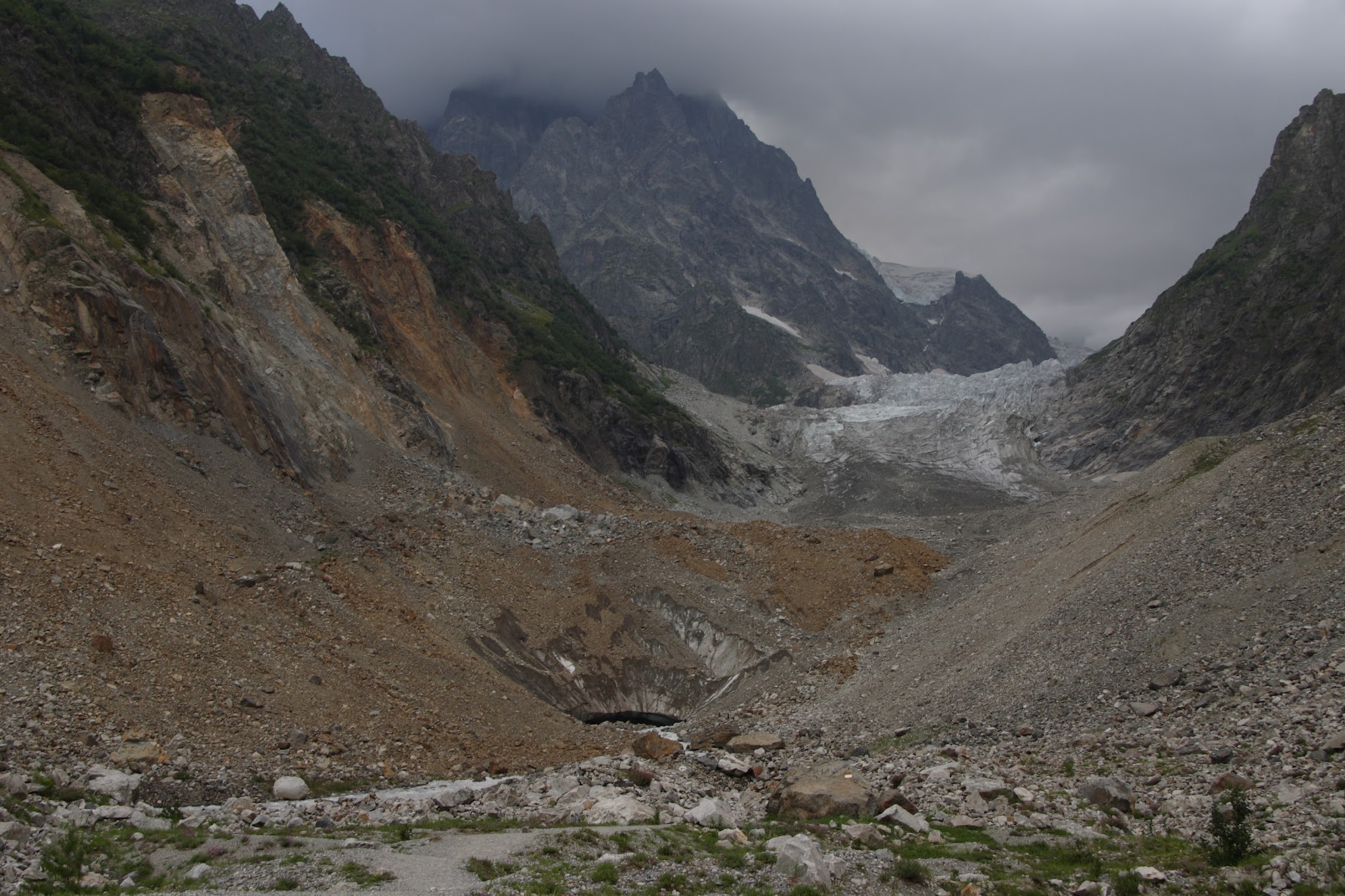 Перевал Грановского совсем страшным не кажется, хотя я отсюда не всё вижу. А вот на Местийский ни за какие коврижки не полезу! Решил, что, если встречу непреодолимые препятствия, то моим запасным вариантом будет довольно высокий курумно-осыпной (ибо южная экспозиция) перевал над ночёвками – оттуда должен быть хороший обзор. Не торопясь, поднялся по морене на ледник, покуда можно было – шёл в ботинках, используя вмёрзшие камни как ступени, а системы нераскрытых трещин – как серпантины тропы.