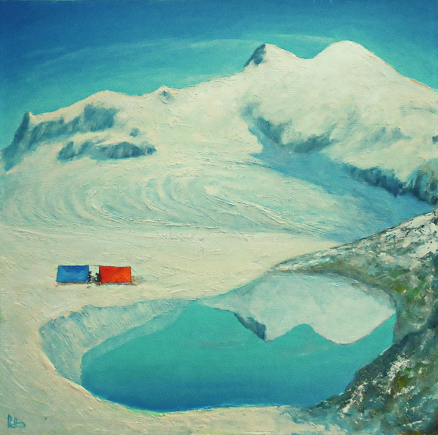 ЗЕРКАЛЬЦЕ ДЛЯ АКСАКАЛА. Под перевалом Эхо войны. Горная четверка с радиальным выходом на Эльбрус с юга, 1976г. Картина доработана в сентябре 2025 года. Станковая живопись, полотно на картоне 40х40см, масло, Виктор Воропаев.