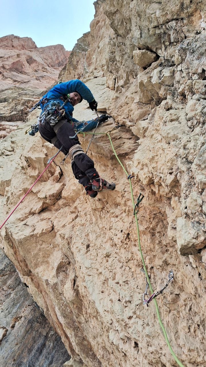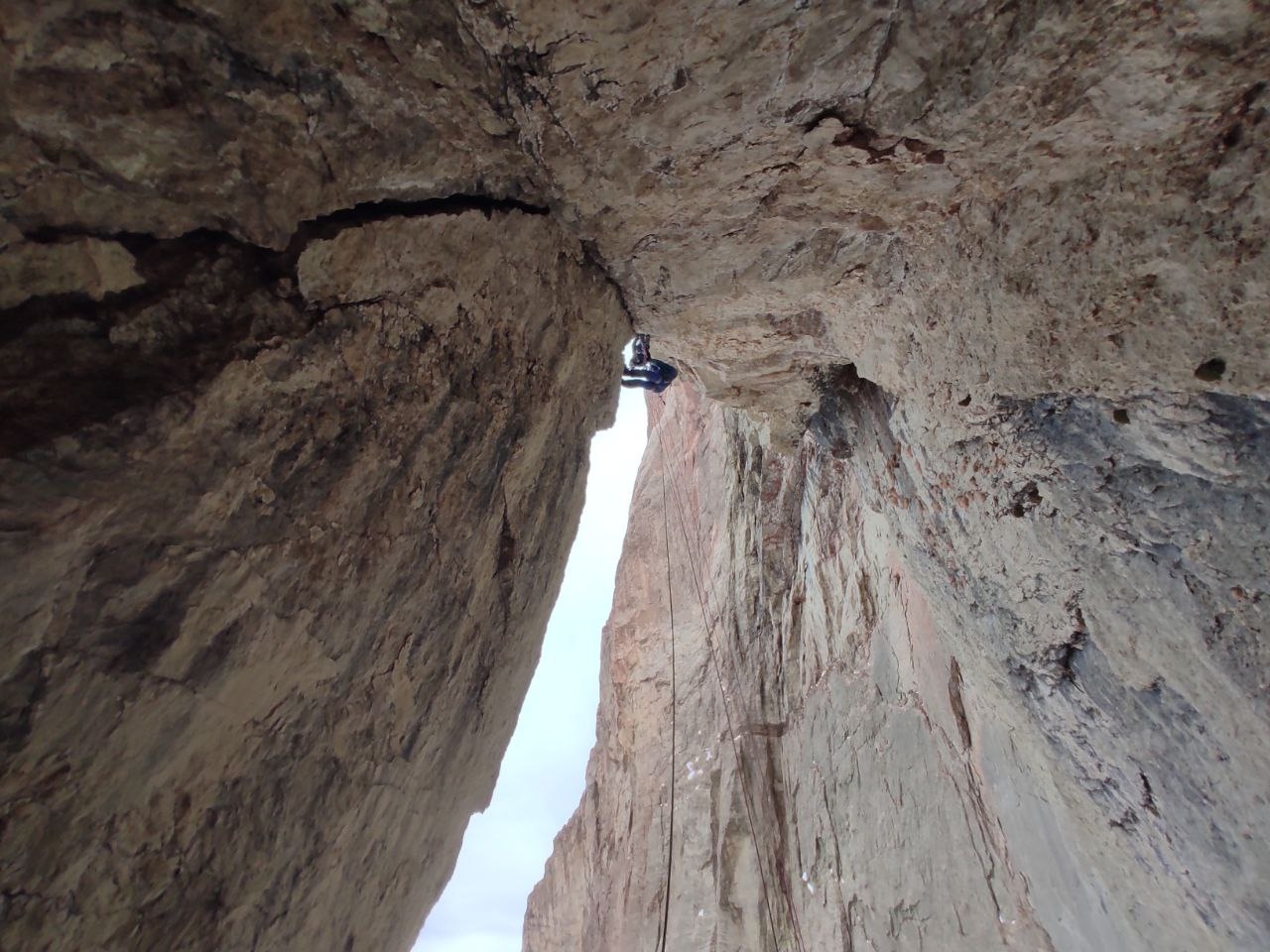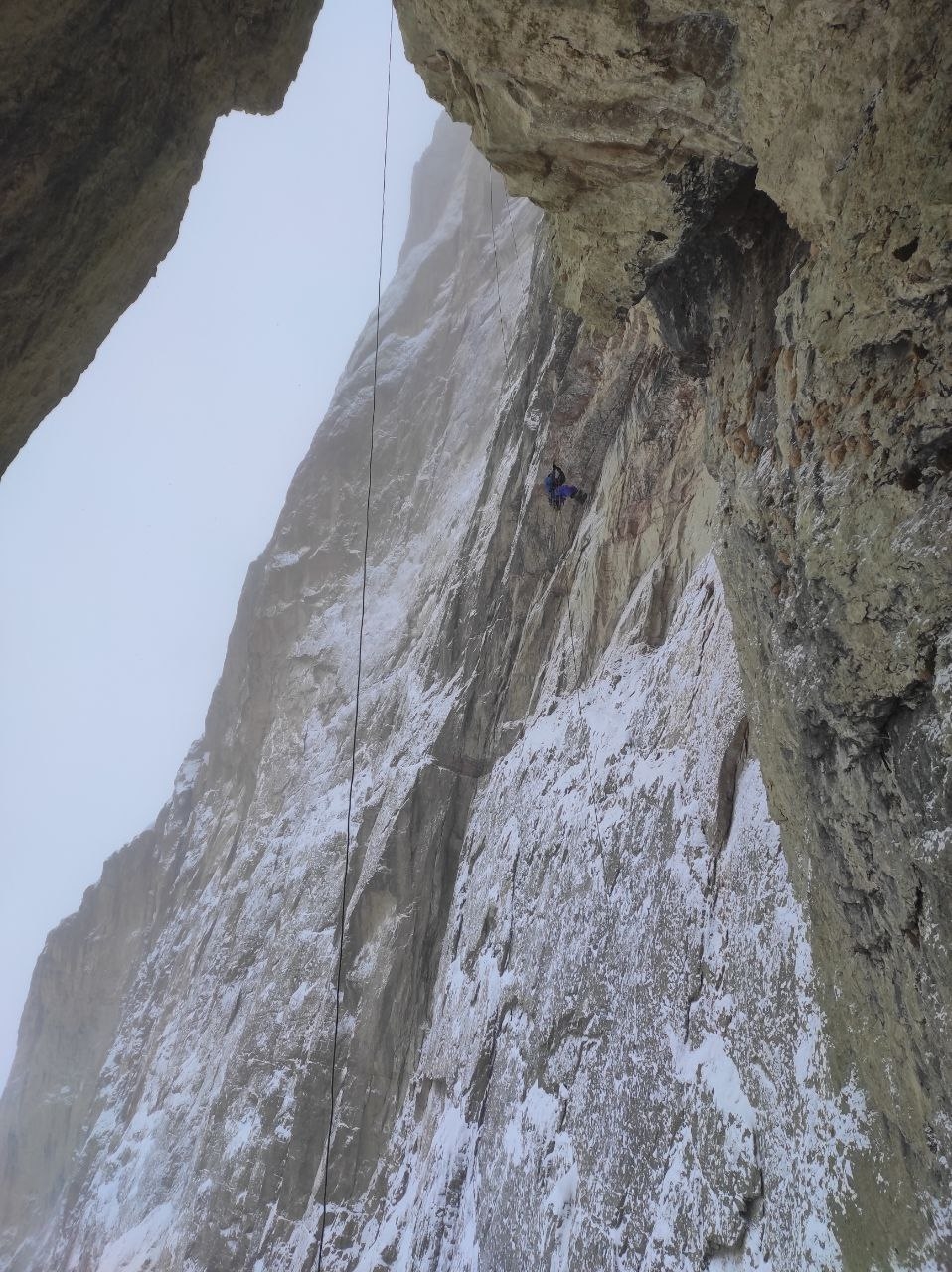 Дневной запал заканчивался и смеркалось. Целый день приходилось демонтировать рельеф, вниз летели глыбы и глыбы породы. Казалось, мы решили разобрать гору до основания. Идти по такой целине выматывало психологически. Спустились ночевать в пещеру - платформу опять не ставили, лишь прикрылись ей от ветра. Пещерку снизу никак не увидеть, скорее всего даже с дрона. Она была для нас полным сюрпризом. Провешенная веревка свисала в 45 метрах в сторону пустоты от того места, где мы были. Чтоб достать до нее нужна была еще одна веревка - чистый потолок. Это было только начало нависания, дай Бог его половина. Мы предвкушали борьбу, жуткую эквилибристику и акробатику при скором переваливании брови арки.