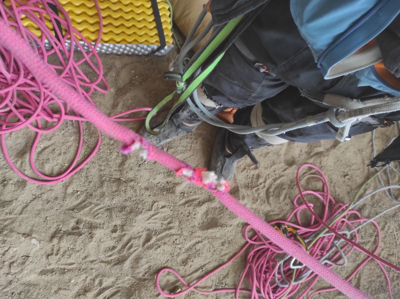 Спуск стал героической борьбой. Женя могучими движениями снимал веревки. Мы с Муравьем вытягивали их из пещеры. Но веревки нам не поддавались. Собрали полиспасты, уперлись ногами. Натянули до состояния струн. Женя в это время летал маятниками и крутился каруселью где-то в белизне неба на хлипком шлямбуре. Я мучительно высчитывал, как мы будем спускаться на пятиметровом обрывке 400 метров А2-А4, если сейчас он уберется со всеми веревками и железом. Пока Женя превозмогал, мы тянули и тянули до безумия. В какой-то момент веревка поддалась и меня впечатало в стену пещеры. Радость перекрыла легкую грусть от контузии. Со свистом в руки прилетел обрывок, висевший на последней пряди и последних двух нитках оплетки - мы почти порвали руками новенькую динамику 2500 кг. Видимо, ее прижало удавкой карабина к скале на этом страшном потолке.