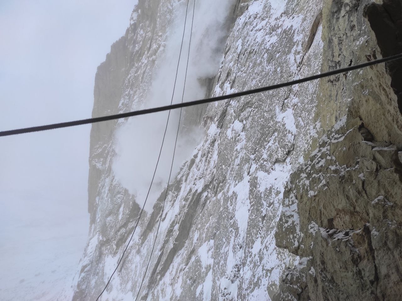 Ближе к рассвету Женя заволновался и заговорил о спуске. Мы удивлялись, но он то лежал с внешнего края пещеры, видел больше и раньше начал все понимать. Через час стало светать и мы увидели последствия ночной метели. По стене, вдруг ставшей белой, шли без остановки лавинки и лавинищи. Даже нависание не спасало. А ведь после арки начнется положилово...